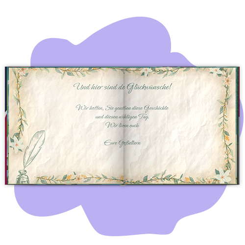Im Buch ist Platz für 5 Fotos und 2 Seiten, auf denen die Gäste ihre Glückwünsche schreiben können.