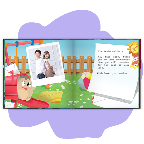 You can include a photo in png or jpg and write a dedication, free of charge, which will be printed at the end of the book to make it even more special.