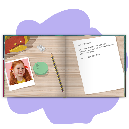You can include a photo in png or jpg and write a dedication, free of charge, which will be printed at the end of the book to make it even more special.