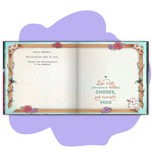 La date et le lieu du baptême seront imprimés, et à la fin du livre, il y a de la place pour des photos et pour que les invités écrivent leurs messages.
