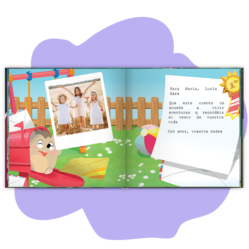 Puedes incluir una foto en png o jpg y escribir una dedicatoria, gratis, que se imprimirán al final del libro, para hacerlo aún más especial.